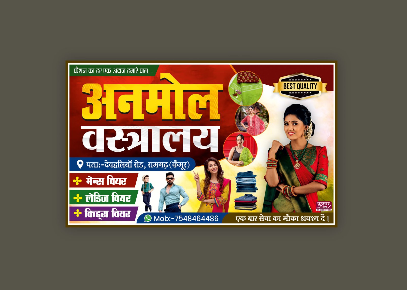 Yah ek Cloth Store Banner Design hai. Garment store ke liye banner design dhoondh rahen toh ye attractive aur beautiful banner design aapke liye best hai. Yah ek multicolor cloth shop banner design hai. Garments aut cloth store ko promote karne aur advertisement karne ke liye yah banner template best hai. Aap iss banner deisgn ke elements like color, images, texts ko easily cutomize aur change kar sakte apne pasand aur need ke according. Print press workers aur graphic designers ke liye yah professionally taiyar kiya gaya banner design perfect hai.