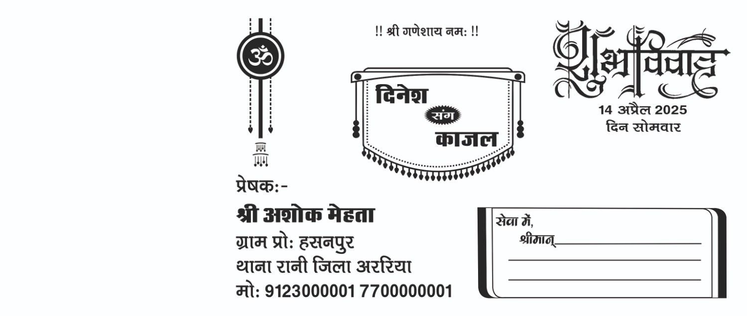 Necessary fonts for this hindu shadi card design are included.  The file is editable in corelDraw. Designed By : Satish Mehta Kuahwaha. Fancy hindu wedding card front and back printing black and white metter design cdr file. New hindu wedding card If you buy this file, you will get Coreldraw file along with fonts. You can fully edit this file. Hindu wedding card Size 260×220, Colour CMYK, designing by Coreldraw software mein kiya gaya hai