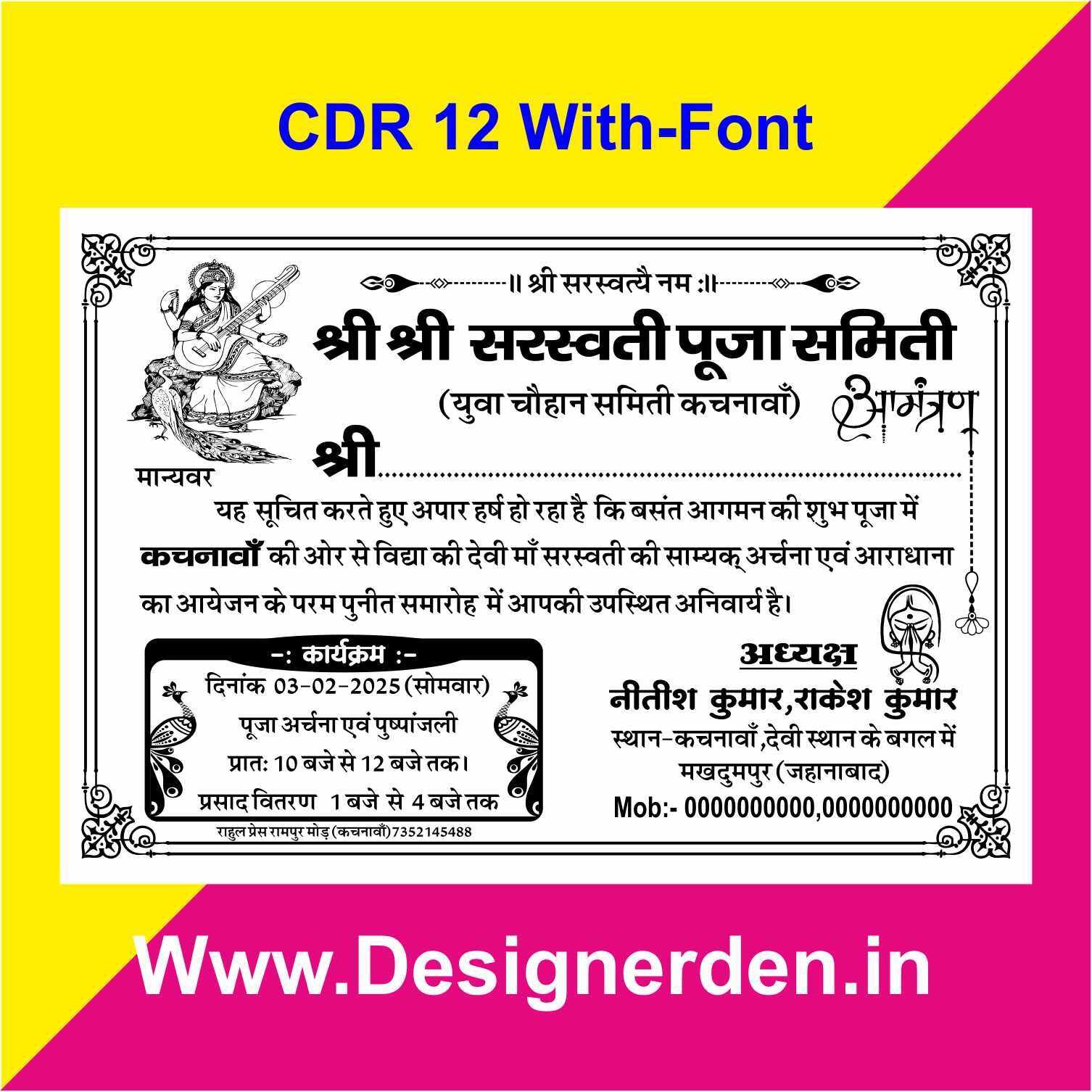 Saraswati Pooja Amantran Matter Card Design. Yah file CorelDraw version X3 se start hone wale sabhi version mein support karta hai. File easily editable hai. Necessary fonts diye gaye hai.