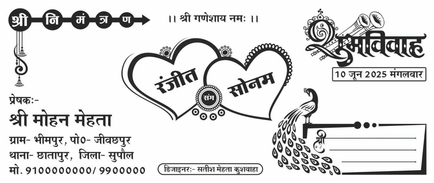 3 versions are included for maximum compatibility that is 12, X7 and 23 ensuring maximum compatibility from version 12 to latest. This Sadi card matter is fully editable in corelDRAW. | Design By : Satish Mehta Kushwaha. Hindu wedding card front and back printing black and white metter design. Wedding card Size 260×220, Colour CMYK, designing by Coreldraw software mein kiya gaya hai. You can resize the file as per your requirement.