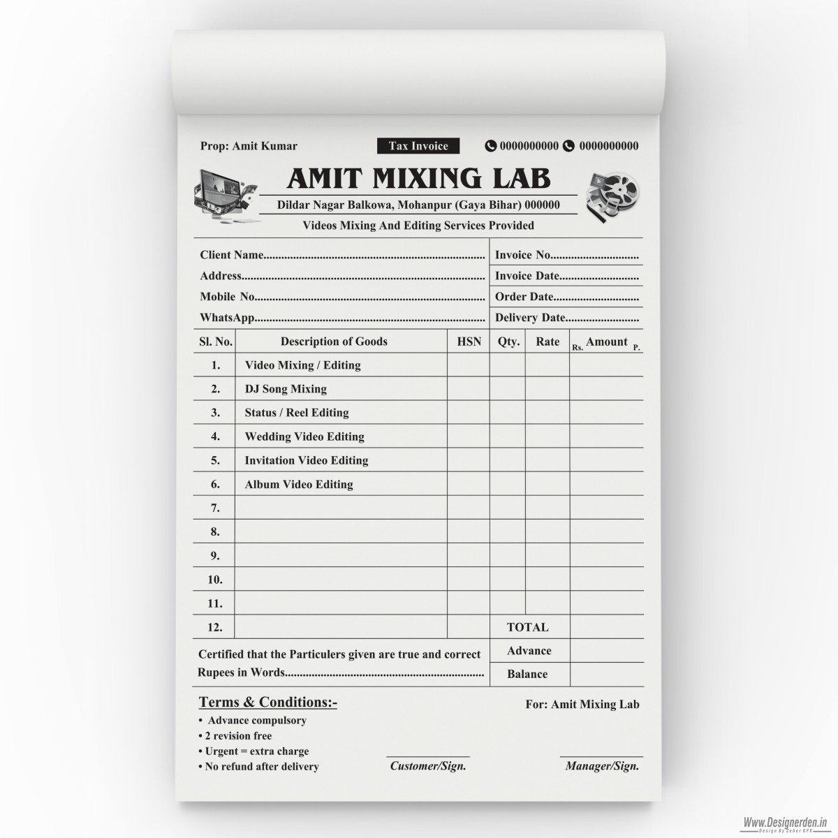 Wedding video mixing lab Bill book design cdr file. Opens only in CorelDRAW.